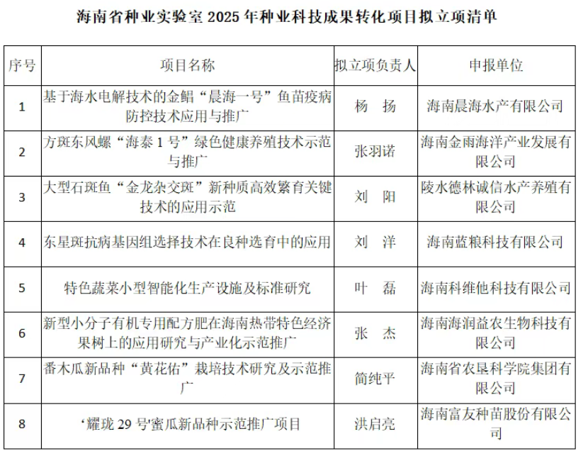 根据实验室工作部署,经公开申报、形式审查、专家评审、实际考察等环节,现将海南省种业实验室2025年种业科技成果转化项目拟立项结果予以公告: