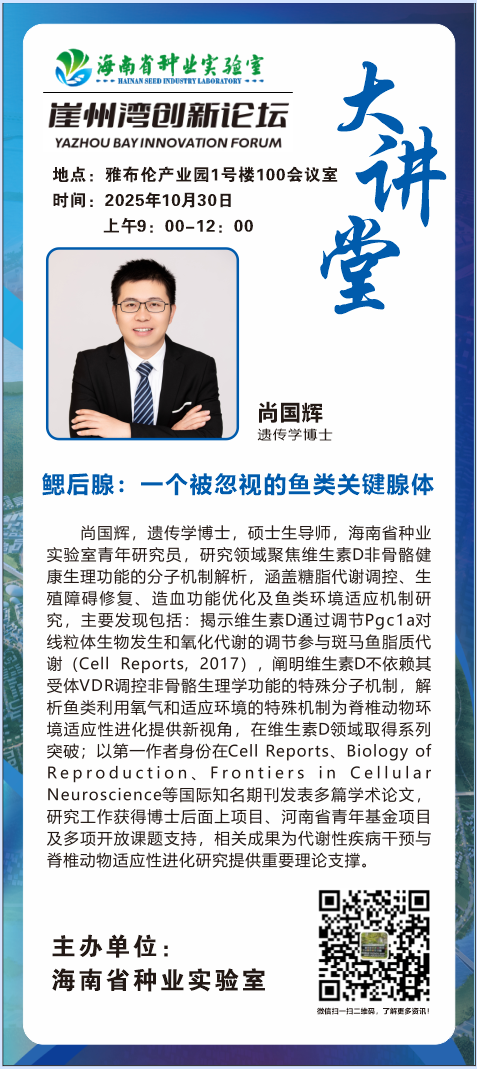 海南省种业实验室计划于2025年10月30日(星期四)上午09:00-12:00,在雅布伦产业园1号楼100会议室举办2025年崖州湾创新论坛大讲堂第四期。本次论坛邀请上海海洋大学陈良标教授、厦门大学徐鹏教授和海南省种业实验室尚国辉青年研究员,围绕“智能与分子科技驱动:探寻鱼类经济性状、营养及腺体新认知”为主题开展学术交流,欢迎各位学者、研究生及业界同仁现场参与。