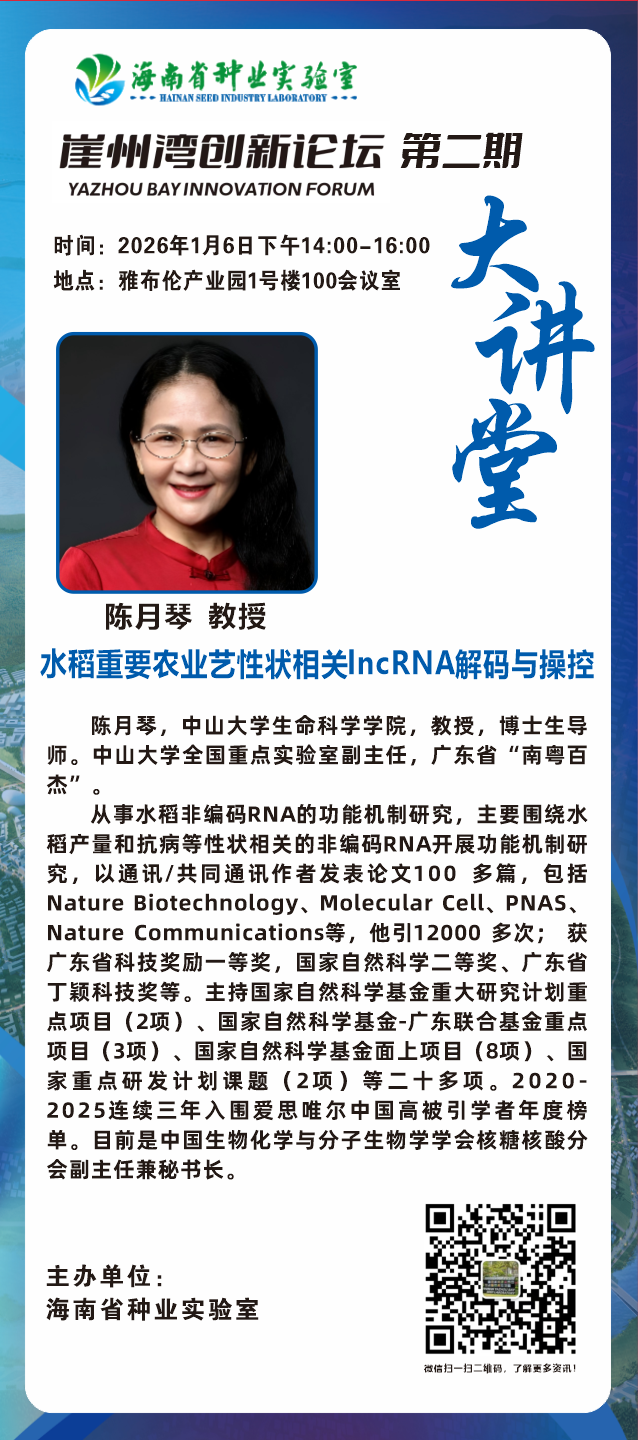 海南省种业实验室拟定于2026年1月6日下午14:00-16:00,在雅布伦产业园1号楼100会议室举办2026年崖州湾创新论坛第二期·大讲堂。本次论坛邀请北京大学陈雪梅院士和中山大学陈月琴教授,围绕“RNA:生物技术的前沿”这一主题开展学术交流。