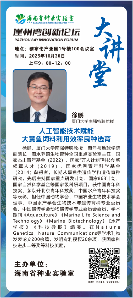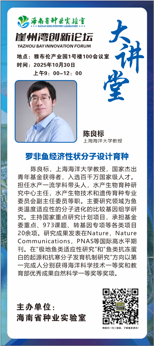 海南省种业实验室计划于2025年10月30日(星期四)上午09:00-12:00,在雅布伦产业园1号楼100会议室举办2025年崖州湾创新论坛大讲堂第四期。本次论坛邀请上海海洋大学陈良标教授、厦门大学徐鹏教授和海南省种业实验室尚国辉青年研究员,围绕“智能与分子科技驱动:探寻鱼类经济性状、营养及腺体新认知”为主题开展学术交流,欢迎各位学者、研究生及业界同仁现场参与。
