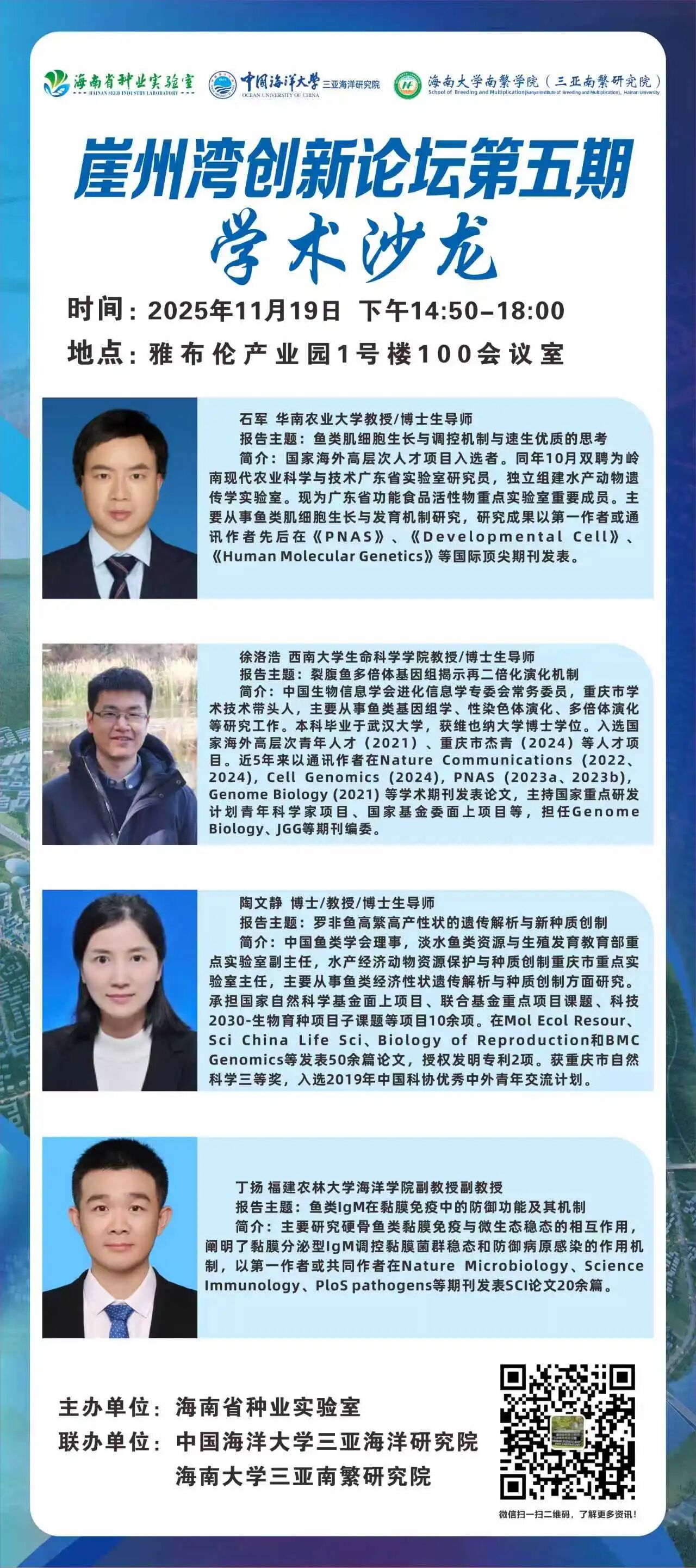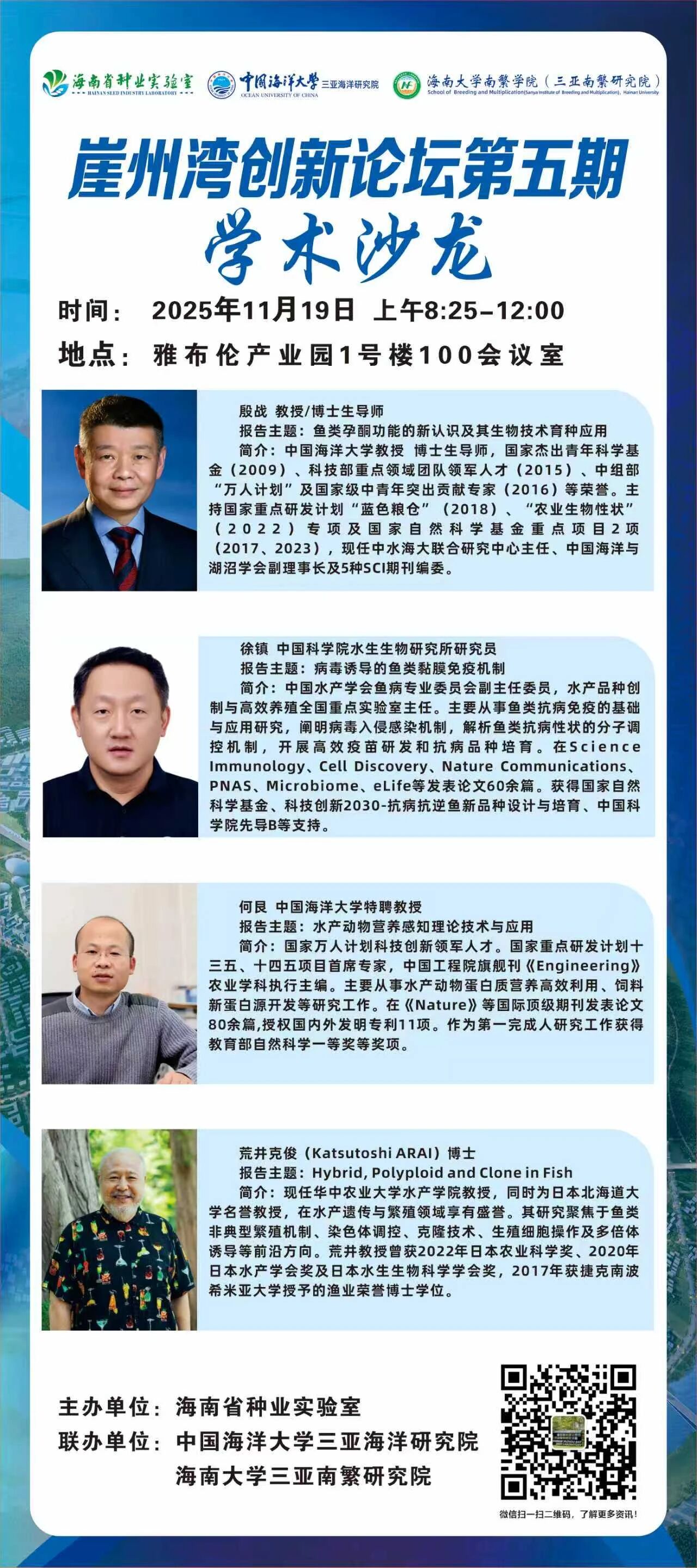 海南省种业实验室联合中国海洋大学三亚海洋研究院及海南大学三亚南繁研究院计划于2025年11月19日(星期三),在雅布伦产业园1号楼100会议室举办2025年崖州湾创新论坛第五期·学术沙龙。本次论坛围绕“融合创新,科技赋能:多学科交叉引领水产养殖新未来”为主题开展学术交流。