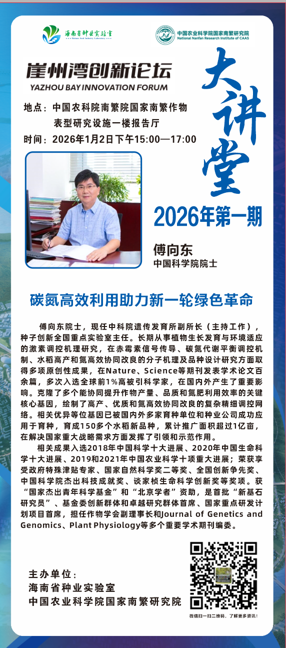 海南省种业实验室拟定于2026年1月2日下午15:00-17:00,在中国农业科学院国家南繁研究院国家南繁作物表型研究设施一楼报告厅举办崖州湾创新论坛大讲堂2026年第一期。此次论坛特邀中国科学院院士、中国科学院遗传与发育生物学研究所傅向东研究员,围绕“碳氮高效利用助力新一轮绿色革命”开展学术交流。