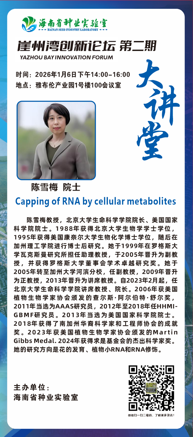 海南省种业实验室拟定于2026年1月6日下午14:00-16:00,在雅布伦产业园1号楼100会议室举办2026年崖州湾创新论坛第二期·大讲堂。本次论坛邀请北京大学陈雪梅院士和中山大学陈月琴教授,围绕“RNA:生物技术的前沿”这一主题开展学术交流。