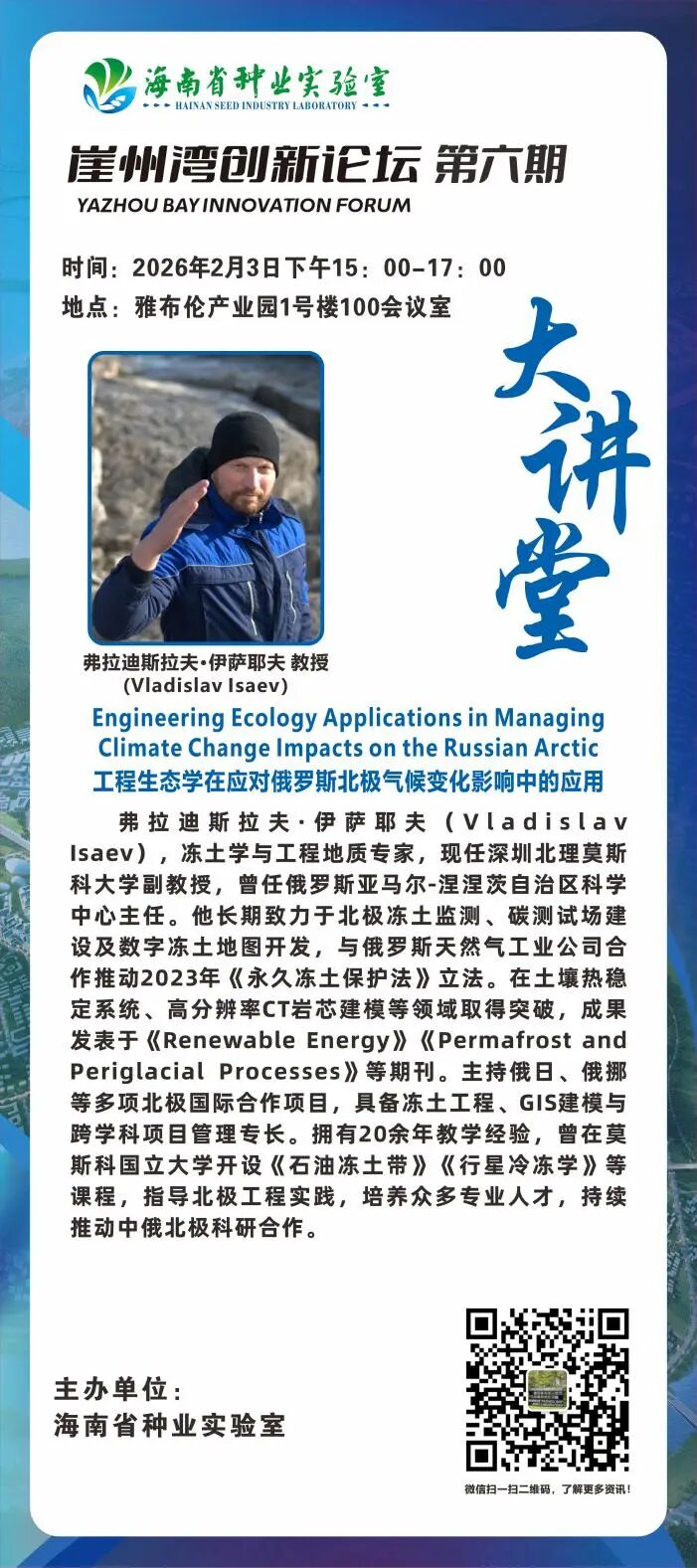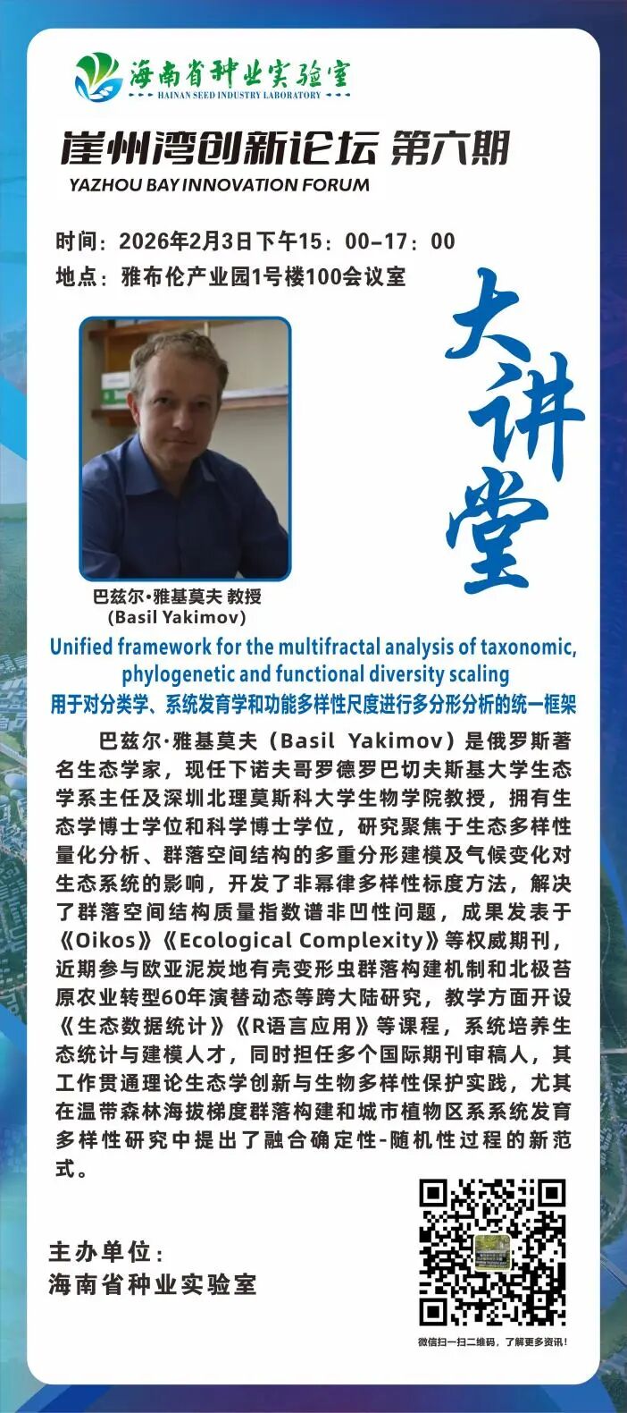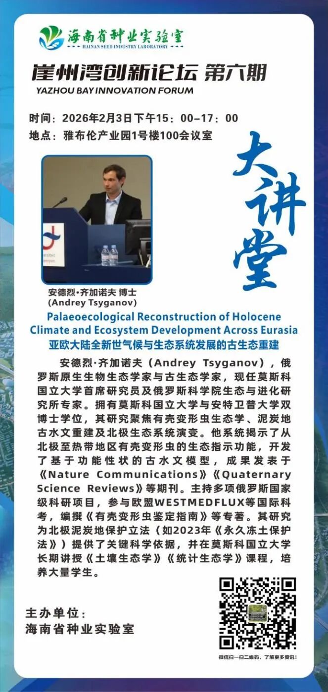 海南省种业实验室拟定于2026年2月3日15:00-17:00,在雅布伦产业园1号楼100会议室举办2026年崖州湾创新论坛第六期·大讲堂。此次论坛特邀俄罗斯著名古生态学家安德烈·齐加诺夫教授、冻土专家弗拉迪斯拉夫·伊萨耶夫教授及理论生态学家巴兹尔·雅基莫夫教授,围绕“亚欧大陆全新世气候与生态系统发展的古生态重建”“工程生态学在应对俄罗斯北极气候变化影响中的应用”及“用于对分类学、系统发育学和功能多样性尺度进行多分形分析的统一框架”等前沿议题开展学术交流。